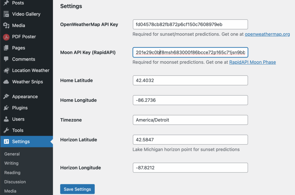 Some of the plugins have settings pages in WordPress, like the group below from the Sun and Moon plugin. This add a tone of new shortcodes, like